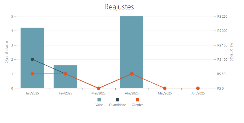 O dashboard de reajustes exibe os contratos que passaram por alteração de valores e mostra o quanto foi reajustado, data do reajuste, tipo de contrato e impacto na receita. Ele ajuda a acompanhar a evolução financeira dos contratos, manter previsibilidade de faturamento e garantir que os reajustes estão sendo aplicados corretamente, conforme política da empresa ou contratos.