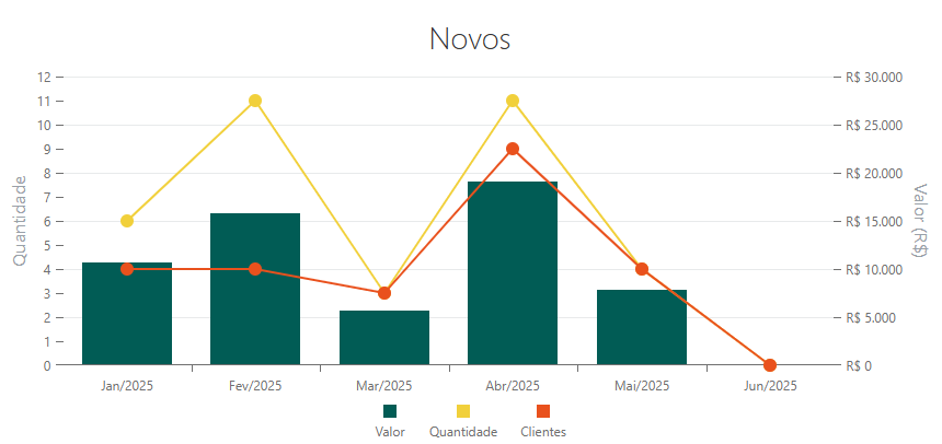 O Dashboard de novos contratos apresenta uma visão dos contratos cadastrados naquele período filtrado, podendo ser por visão de venda ou de faturamento. Nesse painel vai constar os contratos cadastrados conforme a “vigência de início” ou “data de venda” filtrada.